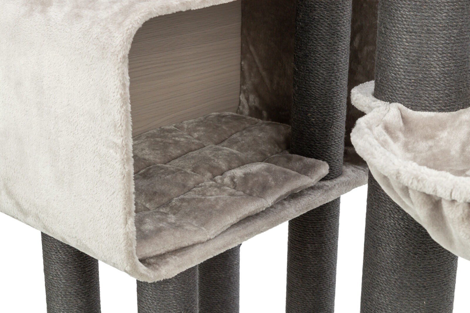 - Schuilplaats binnenin met pluche (polyester) en buitenkant achterkant MDF, gecoat (houtlook).